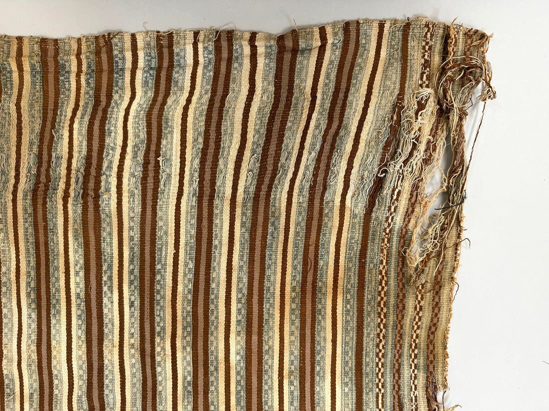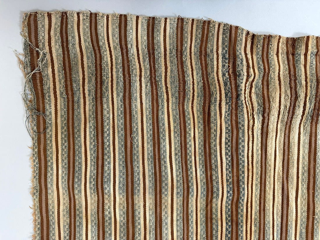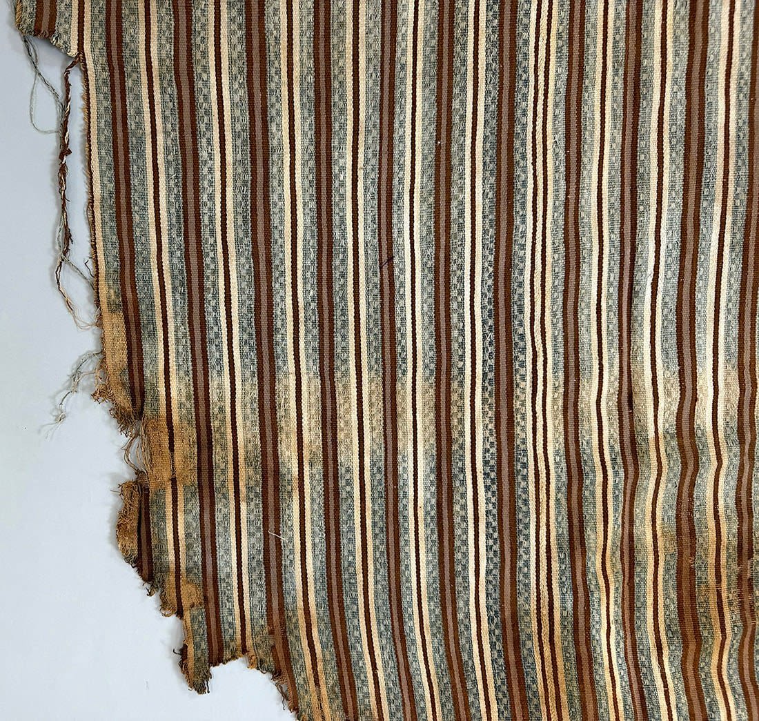 Condition: Fairly poor condition. Part of the textile is burned. Loose thread on multiple places. Visible surface dirt, stain, discoloration, rips and tears.