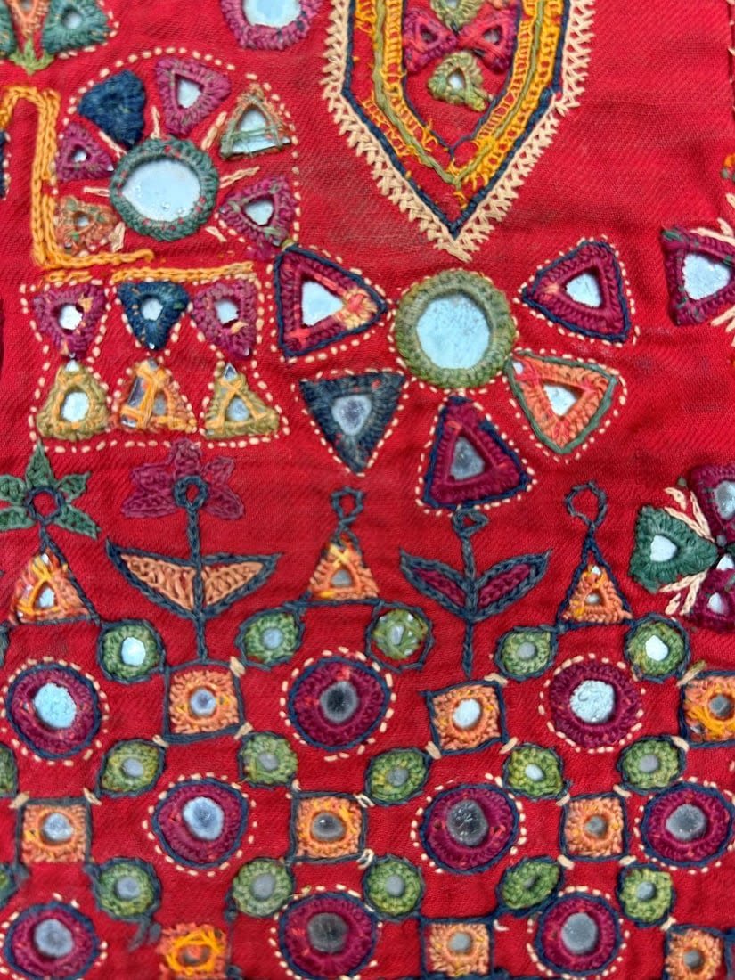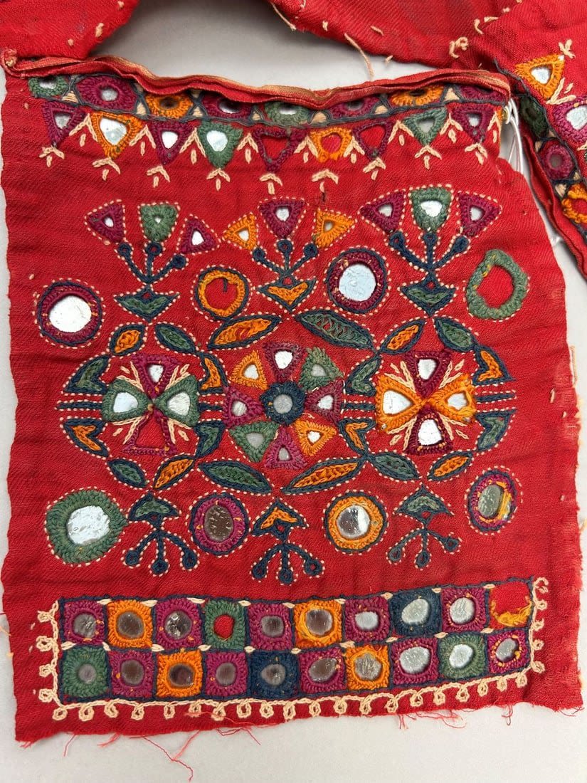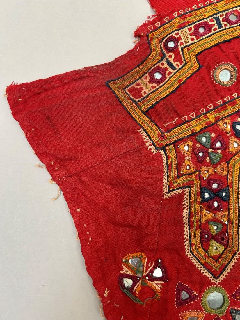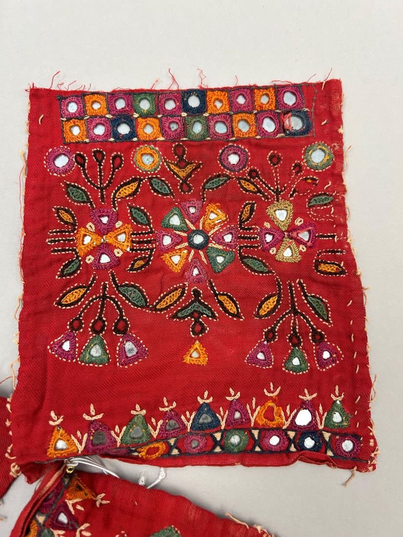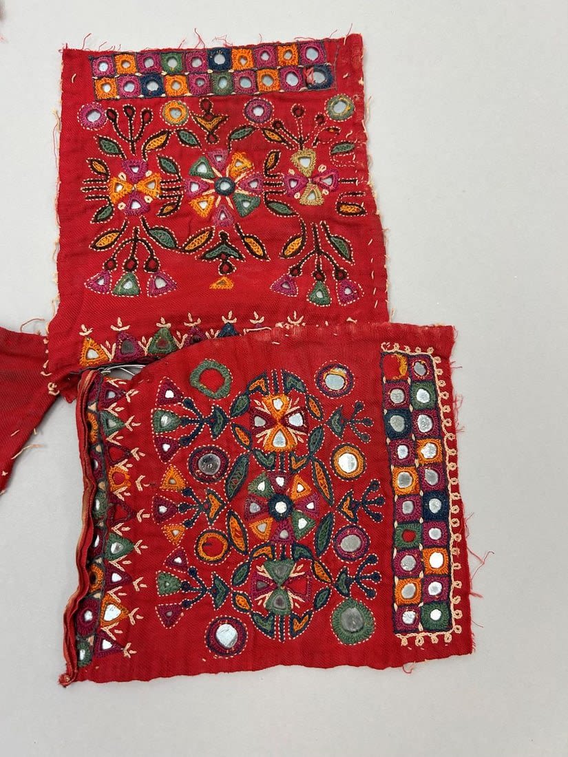 India, Rabari People Blouse Fragments with mirror embroidery pattern, 20"l X 21"w (largest) and 7"l X 6"w (smallest)