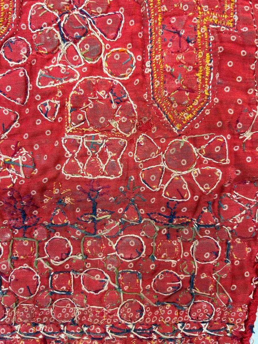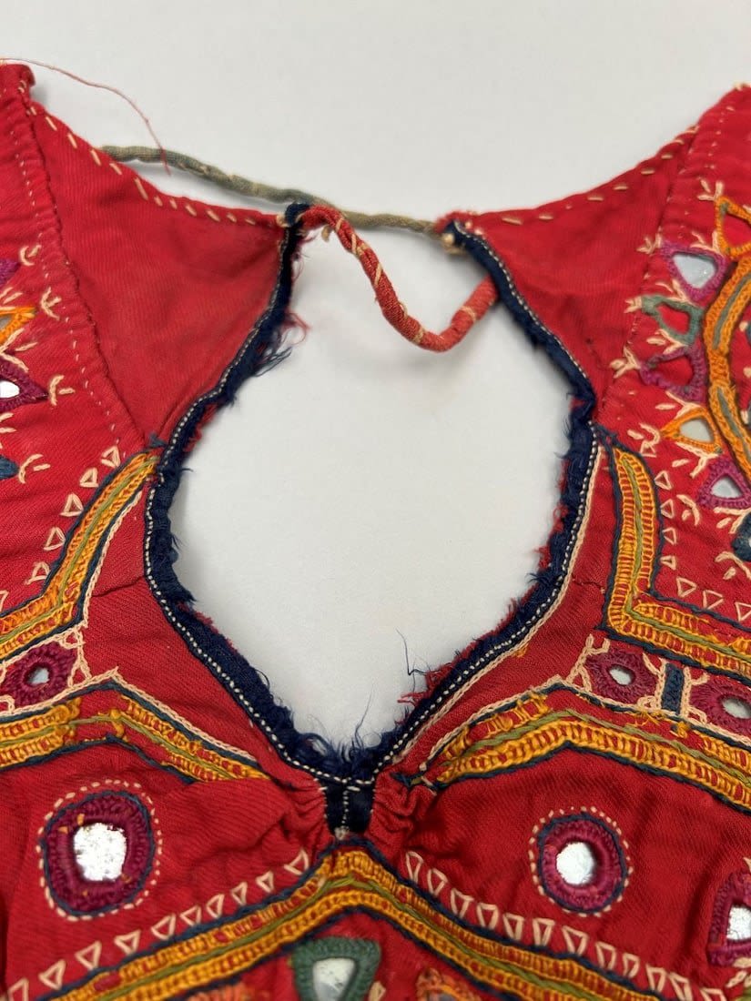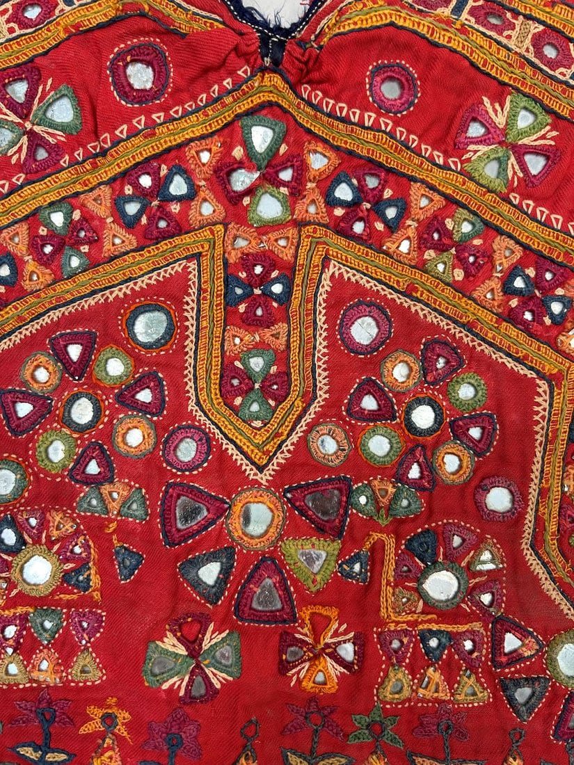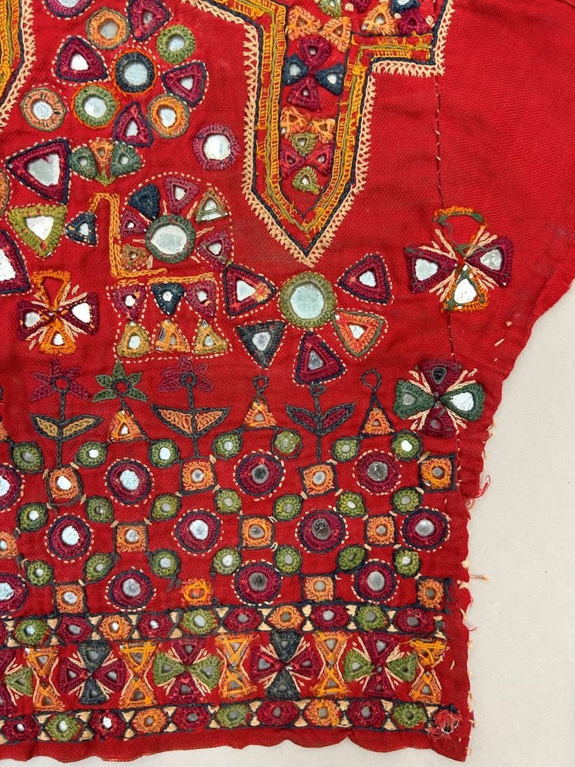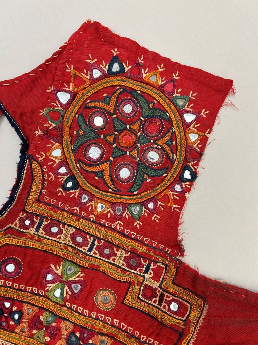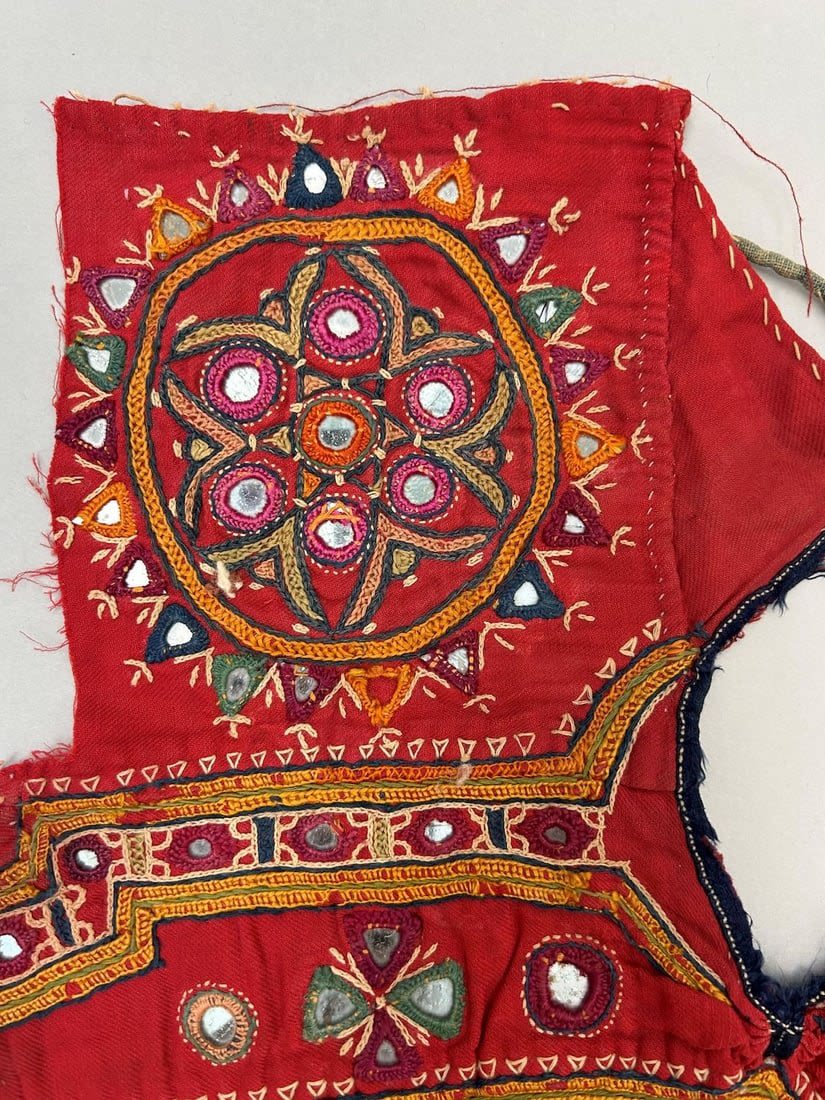 India, Rabari People Blouse Fragments with mirror embroidery pattern, 20"l X 21"w (largest) and 7"l X 6"w (smallest)
