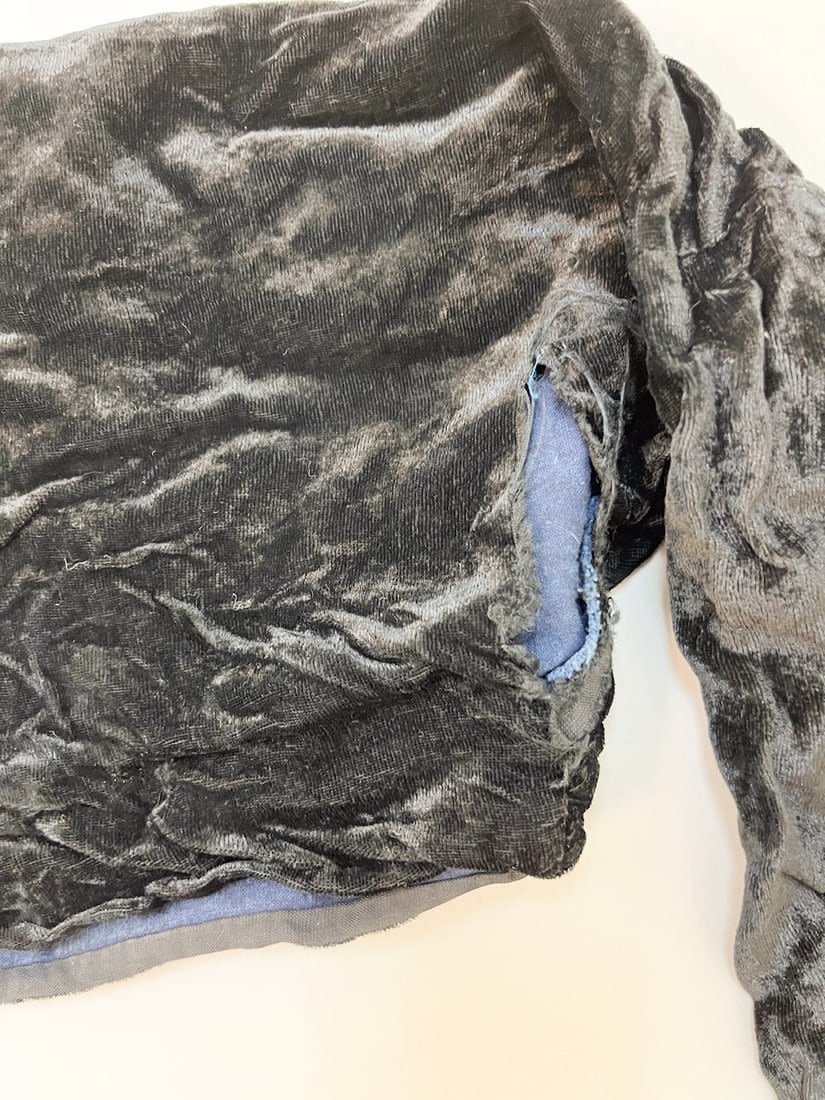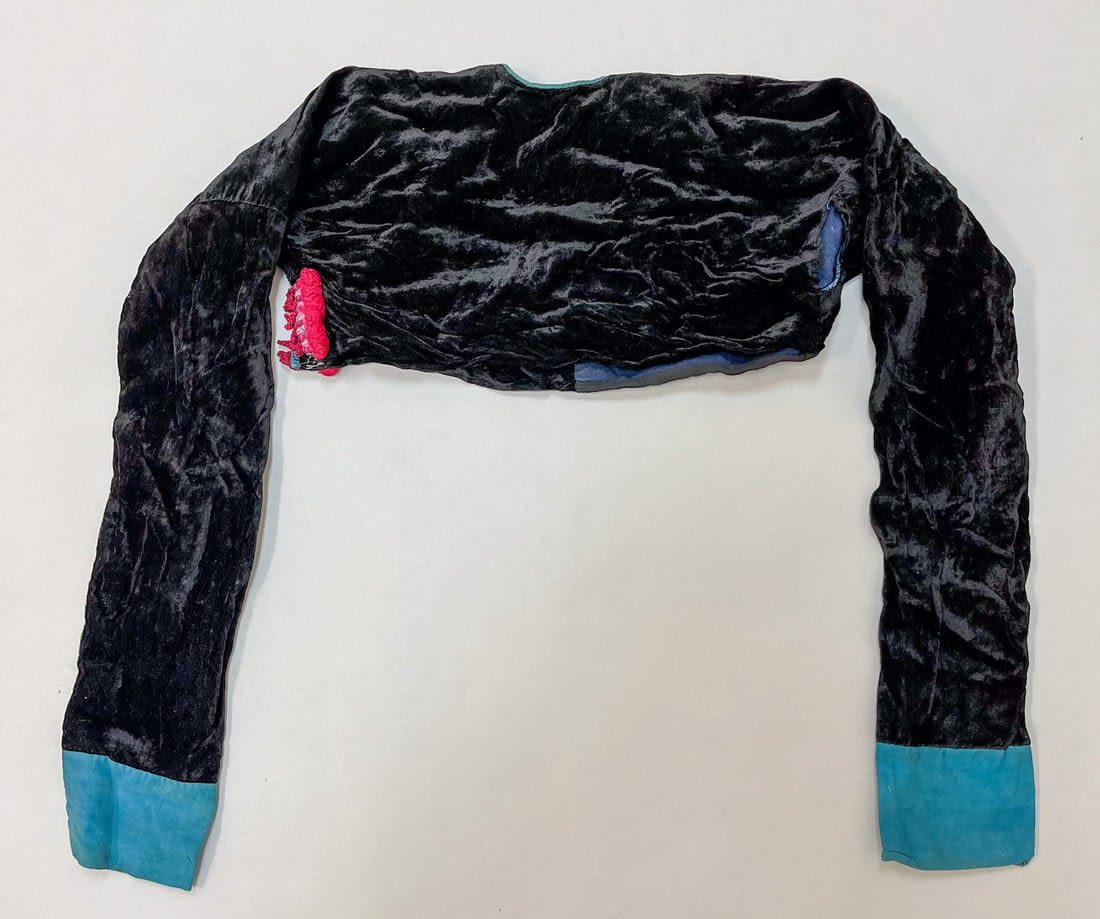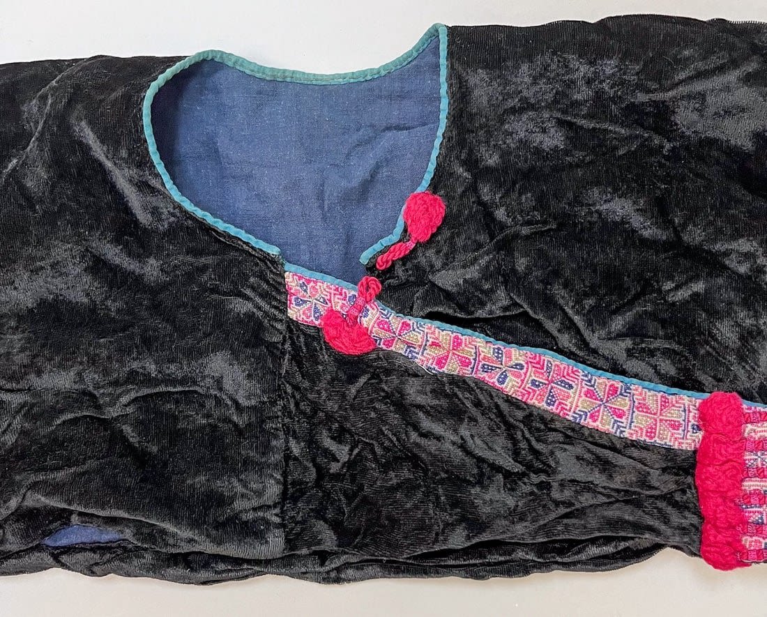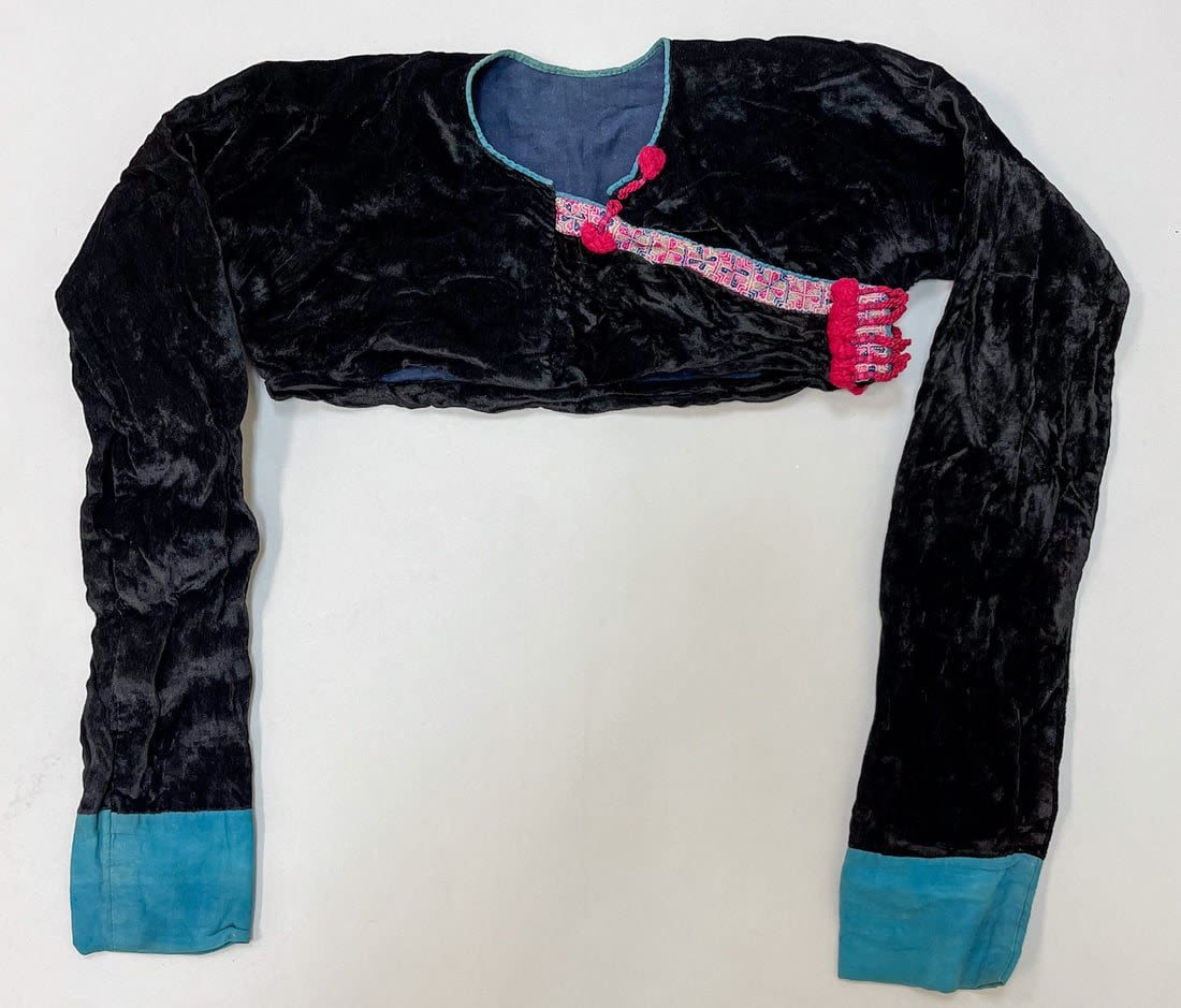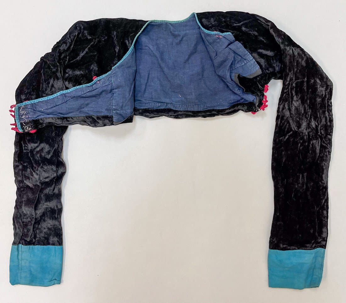Guizhou, South China, vintage black velvet bolero jacket with embroidery accent around the neck, and light blue cotton sleeve cuffs, 9"l x 14"w