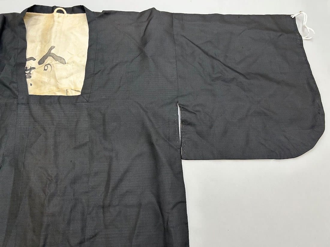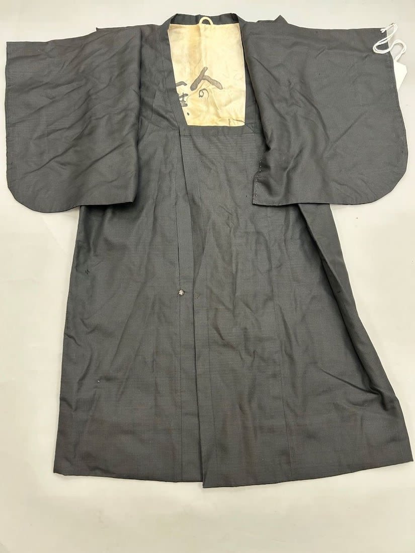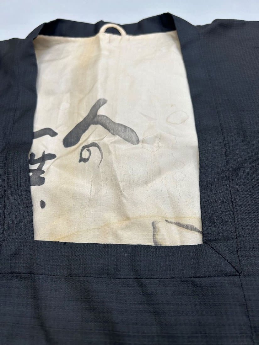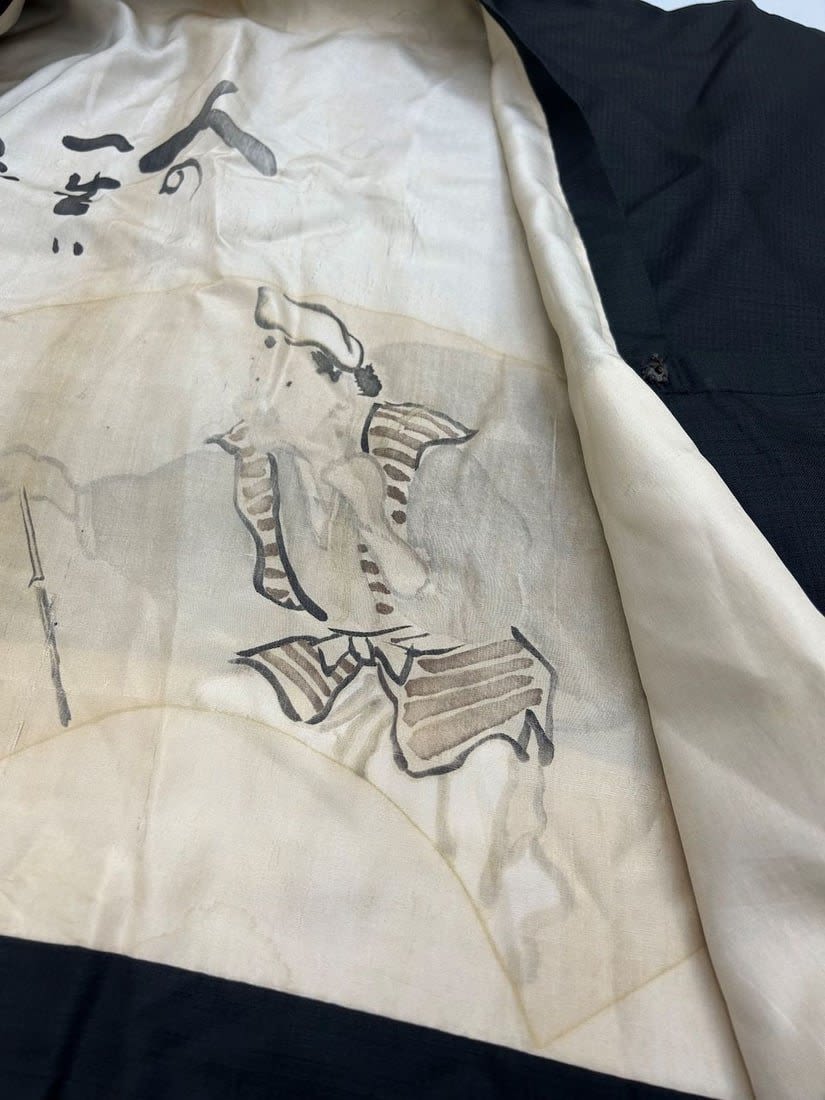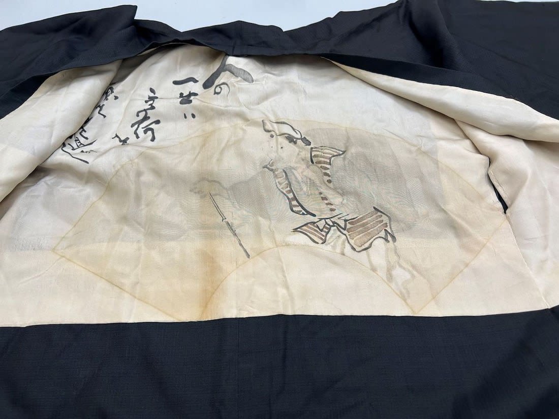 Japan, black silk short kimono, hand painted lining with Japanese characters, 35"l X 53"w 49"shoulder 16 "sleeve length