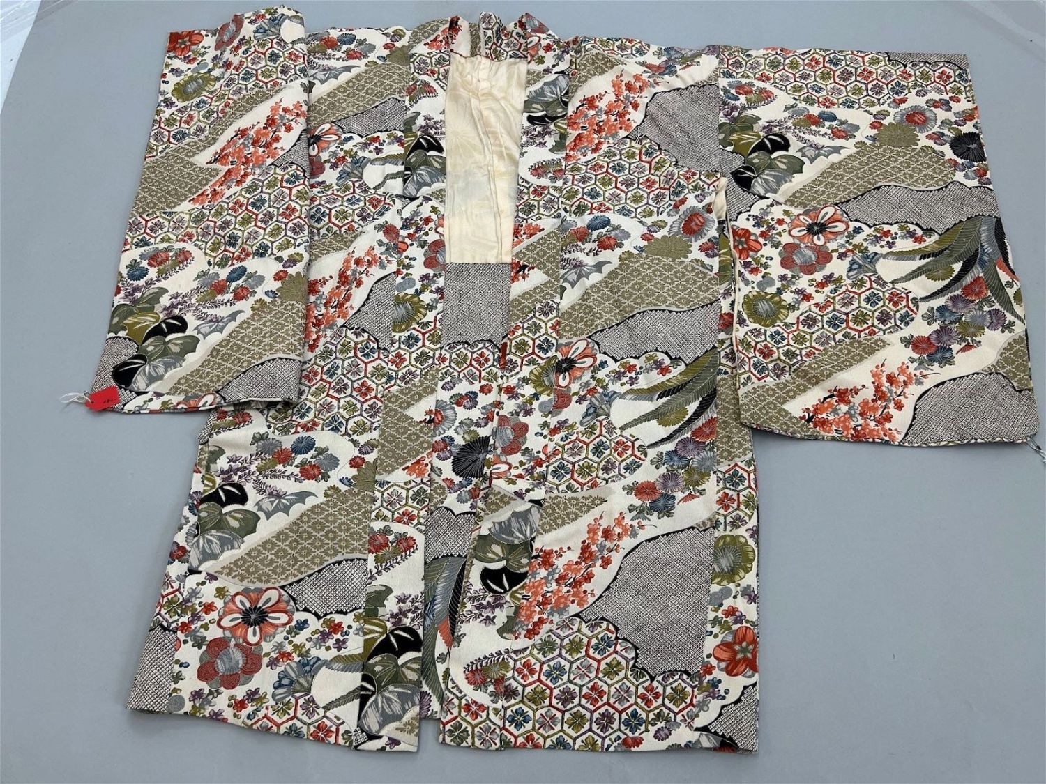 Japan, floral silk crepe pattern kimono, 35"h x 44"w, sleeve 21"l, shoulder 48"w