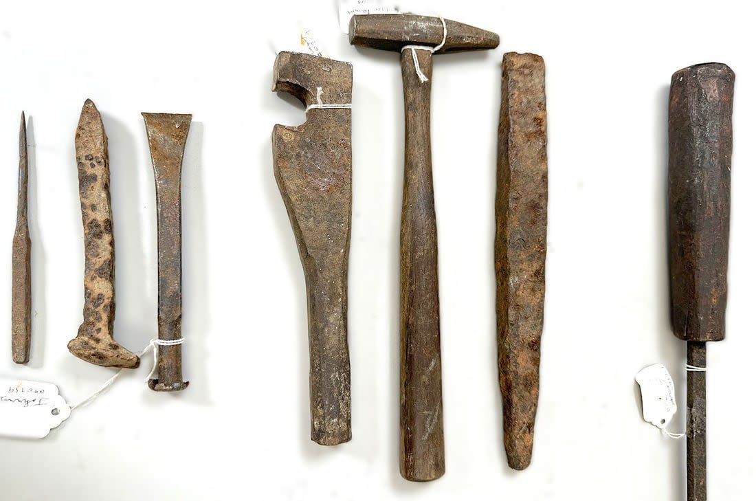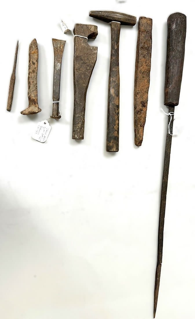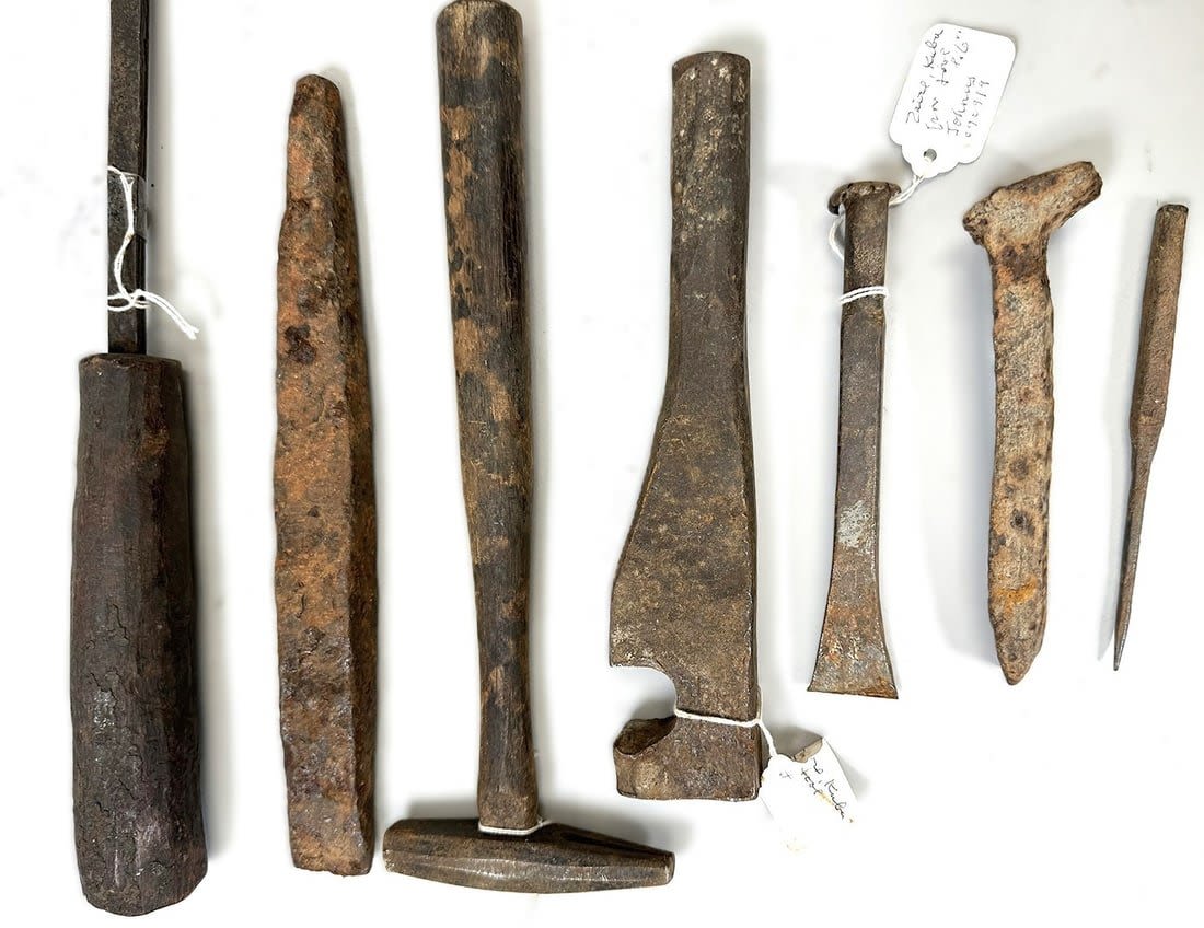 Group of seven iron tools (one with wood handle), Kuba peoples, Central Africa. Dimensions (approx.): 26" (longest) to 5" (shortest)