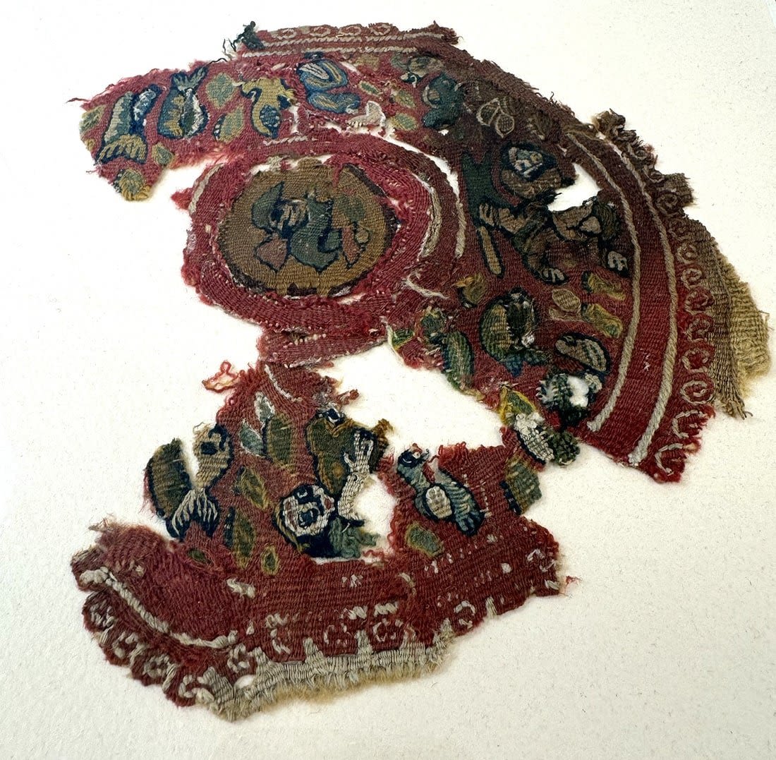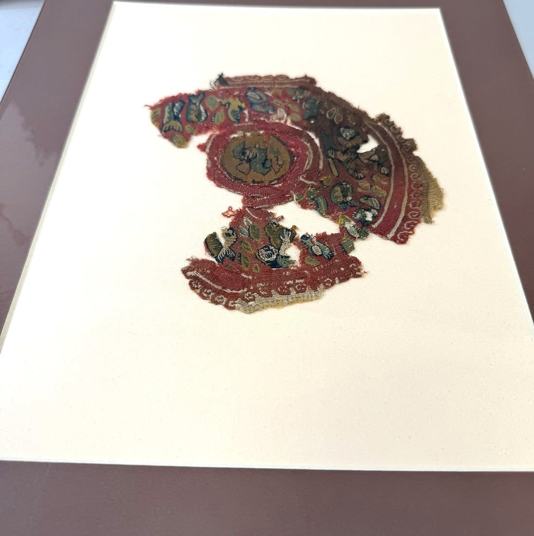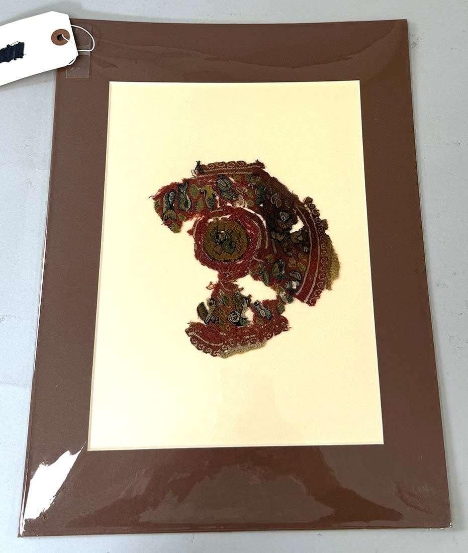 3rd – 11th Century Coptic textile fragment, with human and animal figures, Egypt, North Africa.? Approximate size 6.25" diameter, with a mat with outside dimensions 16"H x 12"W