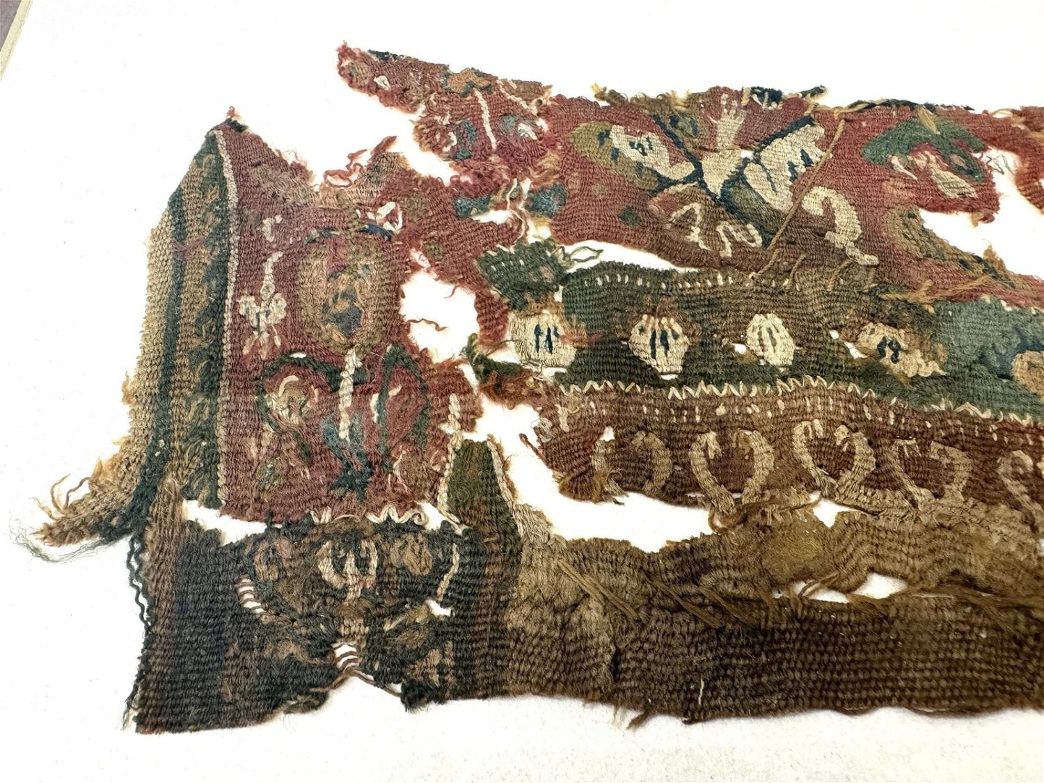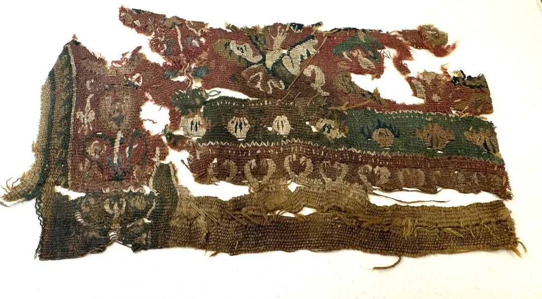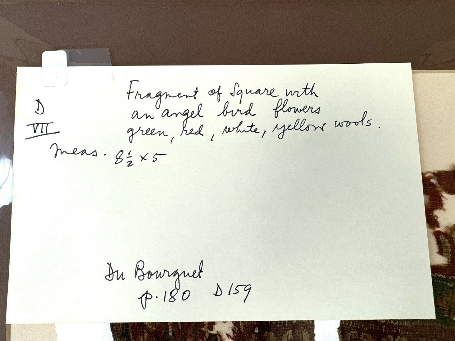 3rd – 11th Century Coptic textile fragment, with an angel, bird and flowers, Egypt, North Africa.? Approximate size 5" x 8", with a mat with outside dimensions 16"H x 12"W.