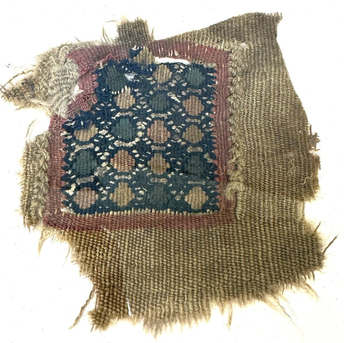 3rd – 11th Century Coptic textile fragments, five (5) square medallion forms with polychromatic designs, Egypt, North Africa.?Approximate dimensions 3" x 3" (smallest) to 3.5" x 4" (largest), with a mat with outside dimensions 20"H x 16"W