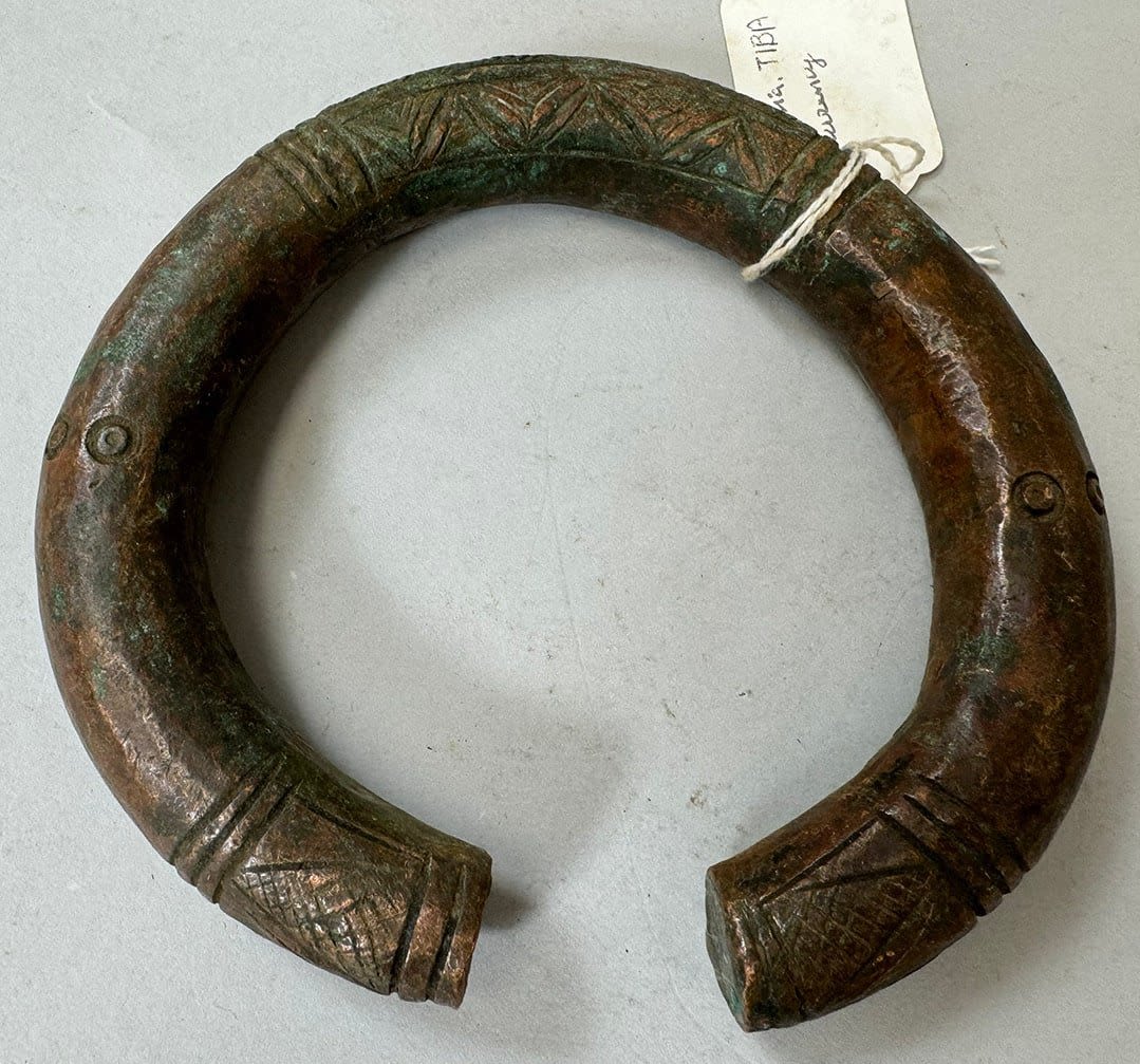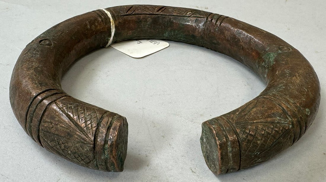 Six (6) iron, copper and copper alloy currencies, tools, etc., various cultures, West and Central Africa. Dimensions (approx.): 9" (longest) to 3.25" (shortest)