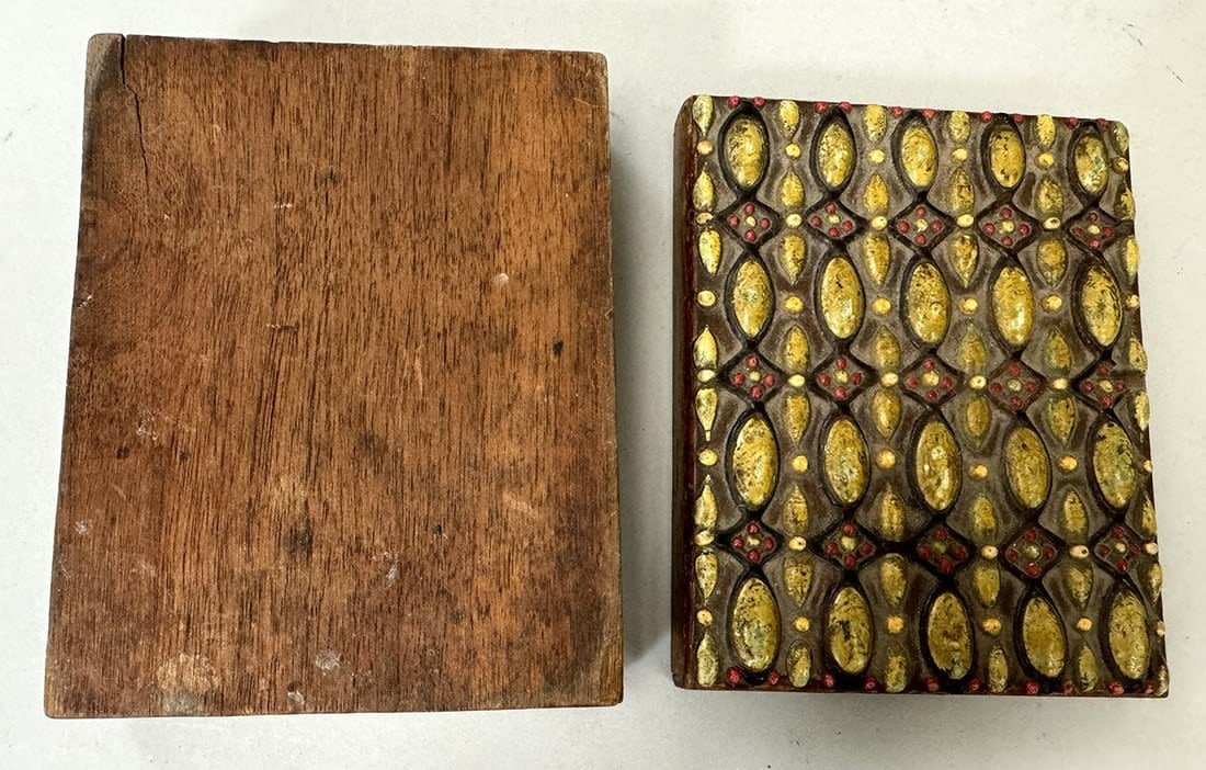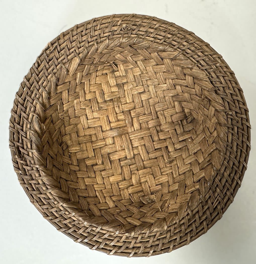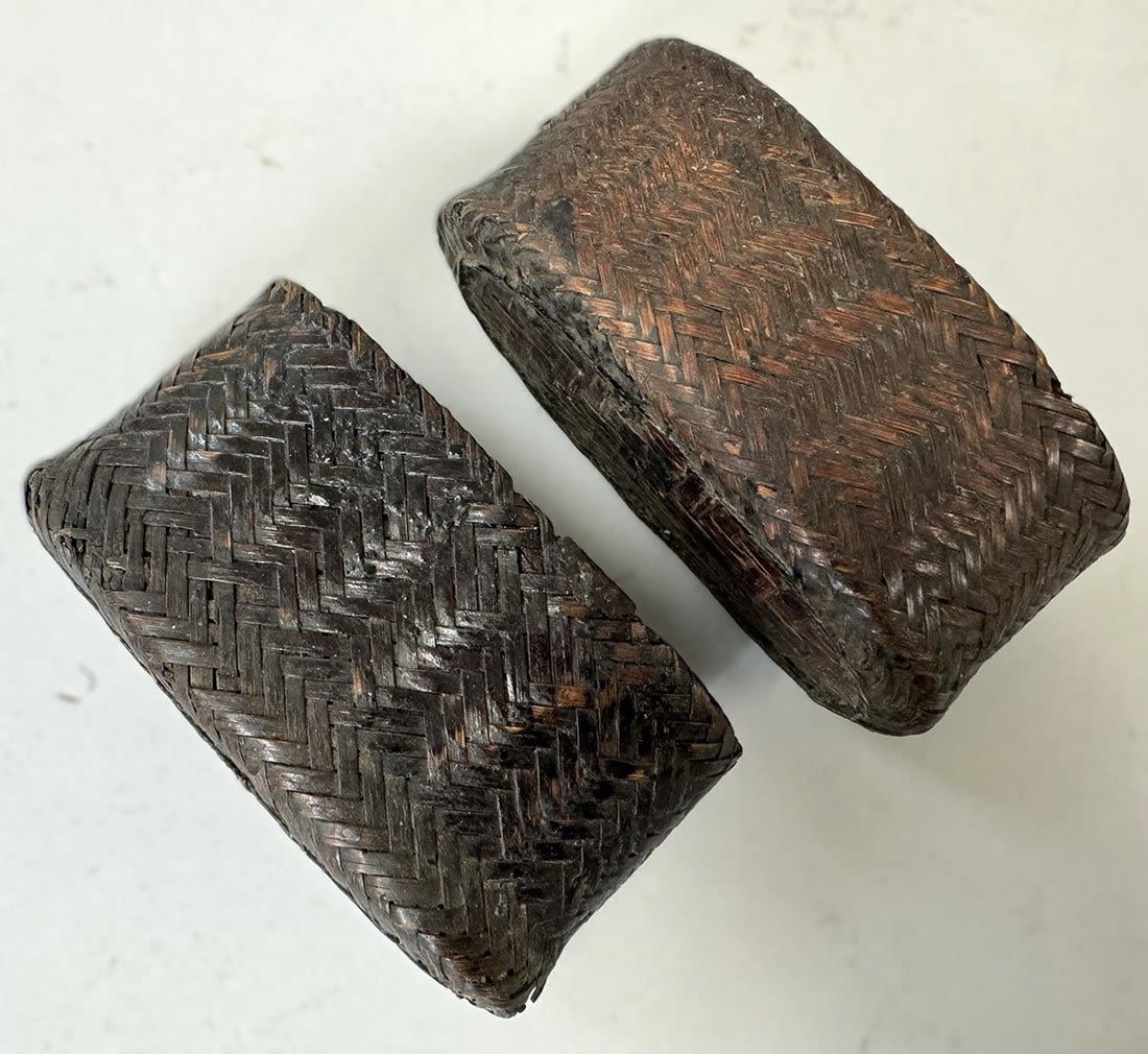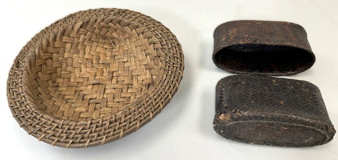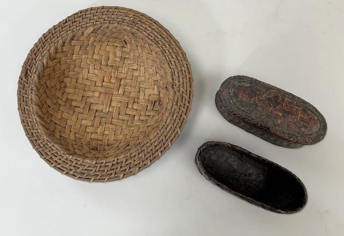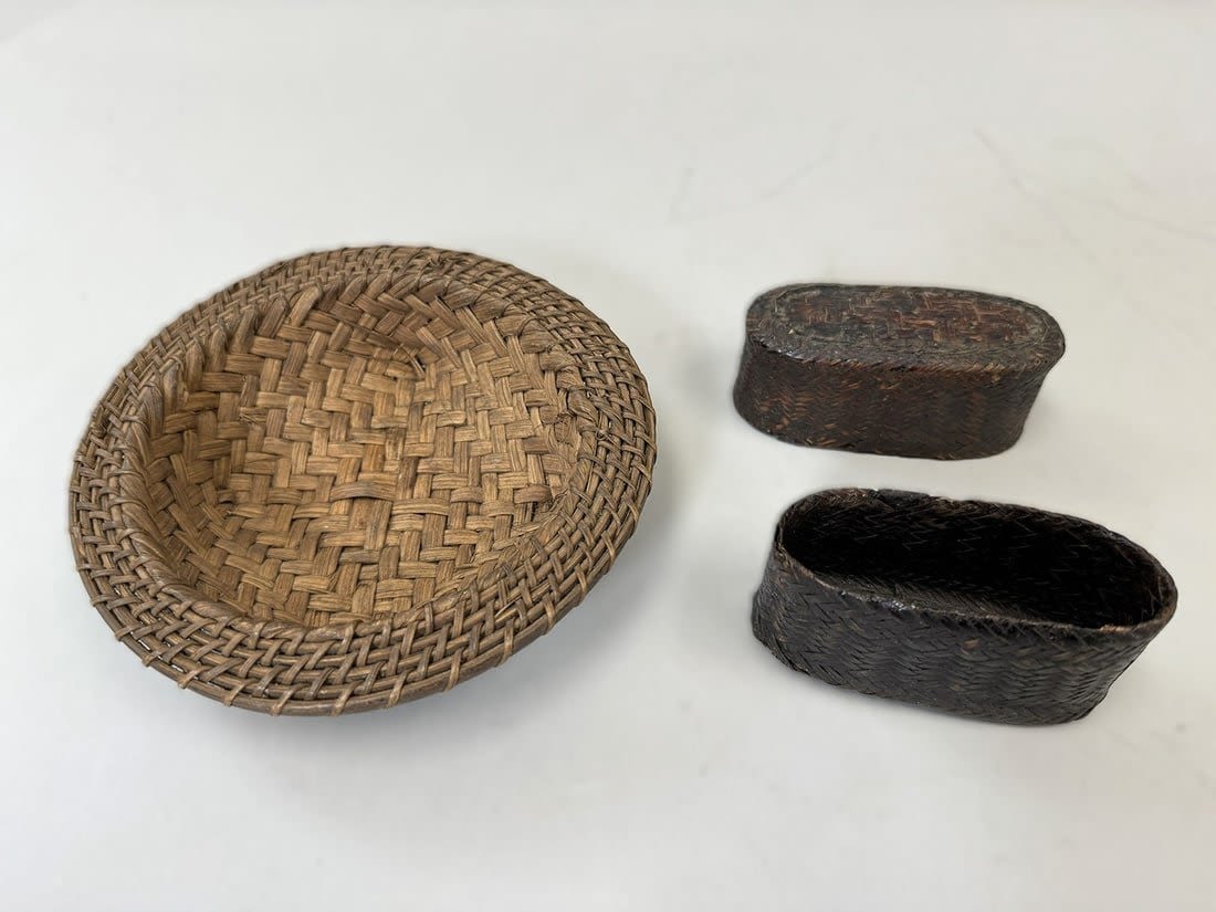 Four (4) Kuba items, including a tray, two boxes and a gourd vessel, Democratic Republic of the Congo, Central Africa. Dimensions (approx.): 9" high x 6.5" diameter (largest) to 4" x 2" x 1.5" (smallest)