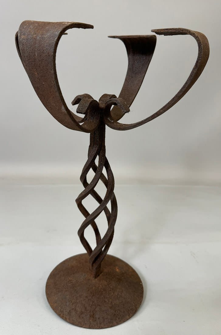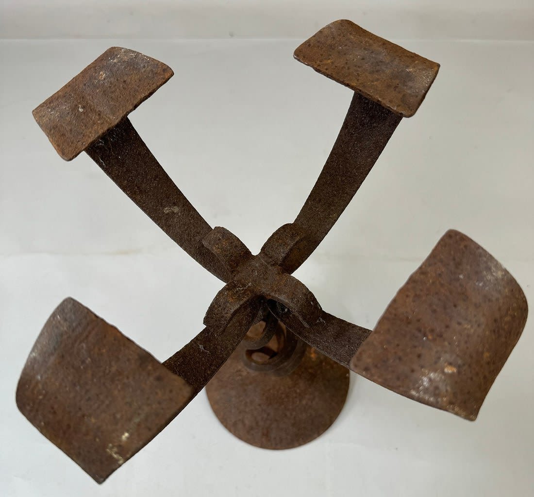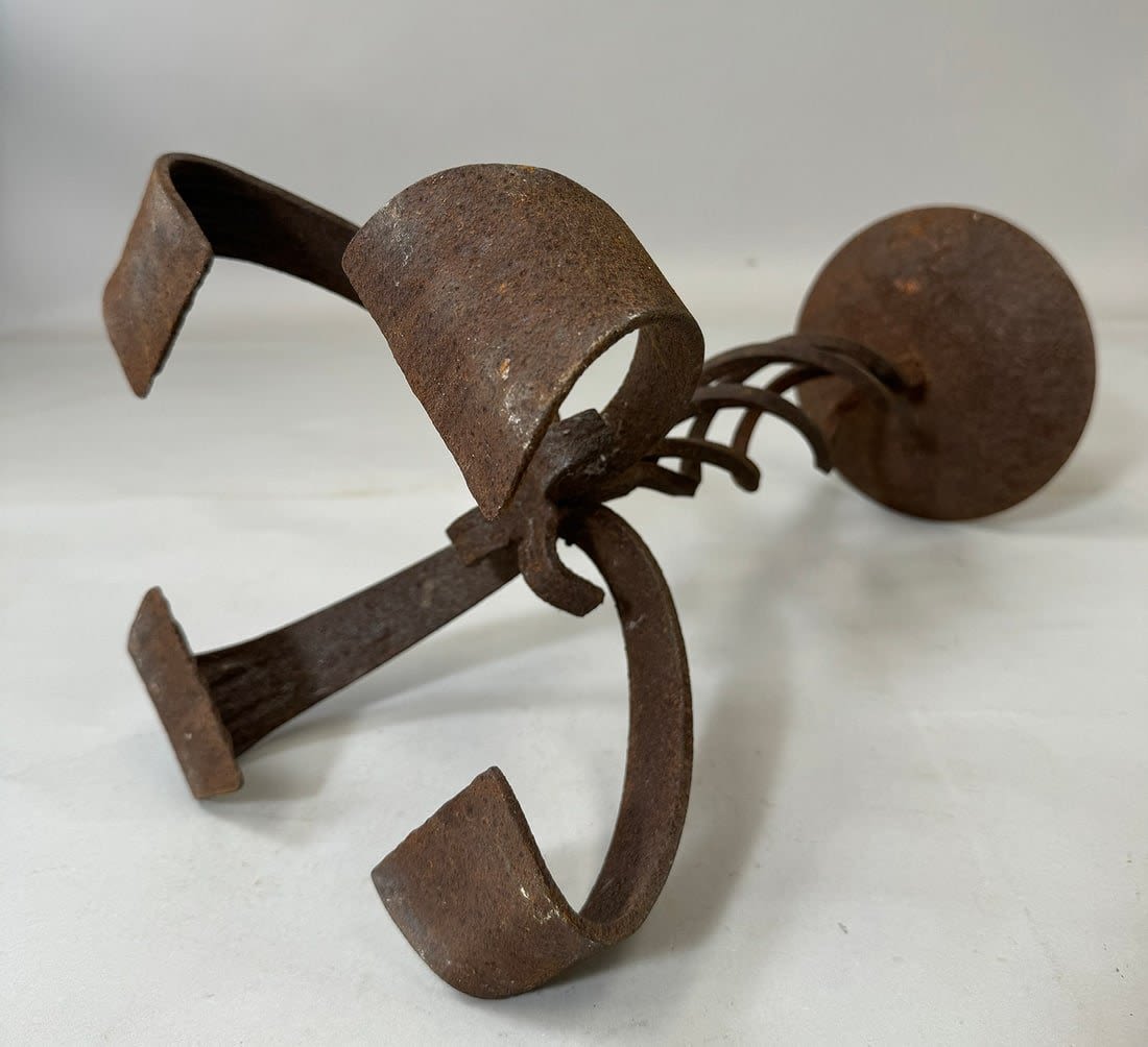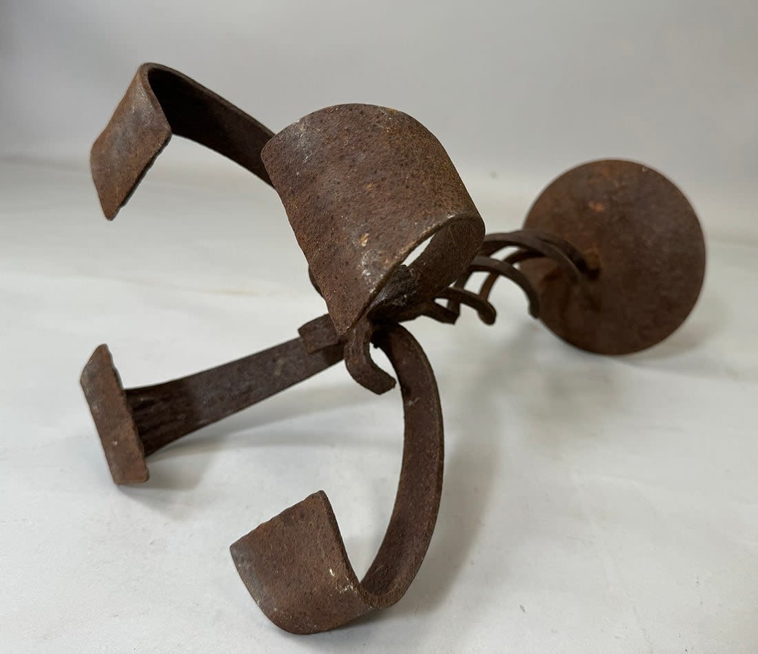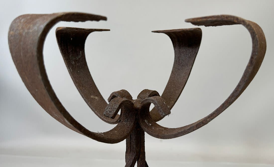 Forged iron stand for oil lamp/candle, Yoruba peoples, Nigeria, West Africa. Approximate size, 17.75" tall, 11" wide