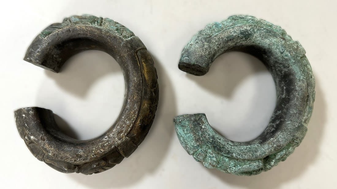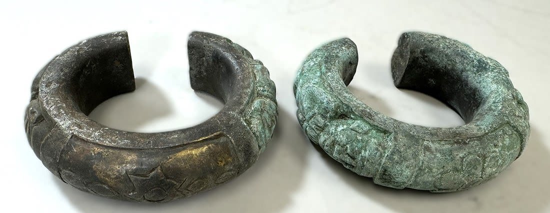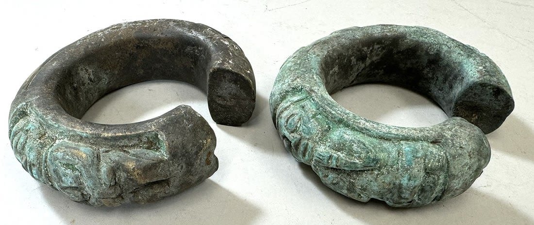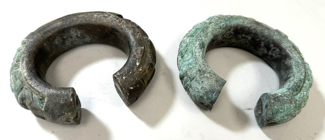 Two (2) Bakuba copper alloy currency bracelets, Democratic Republic of the Congo, Central Africa. Dimensions (approx.): 5.5" x 4.5" x 1.5" (each)