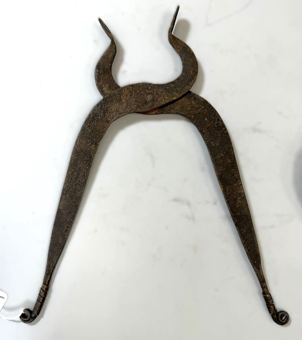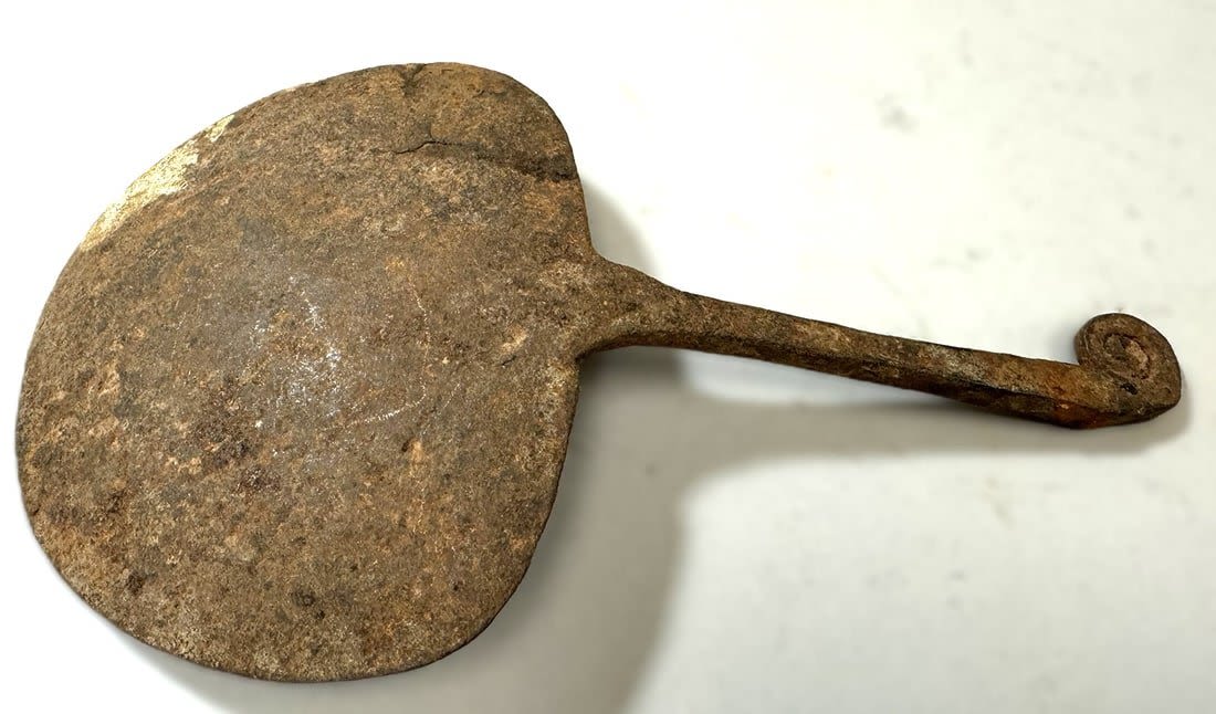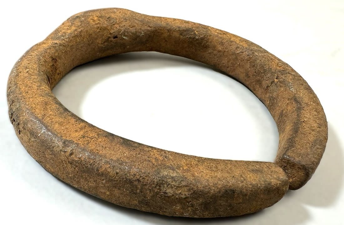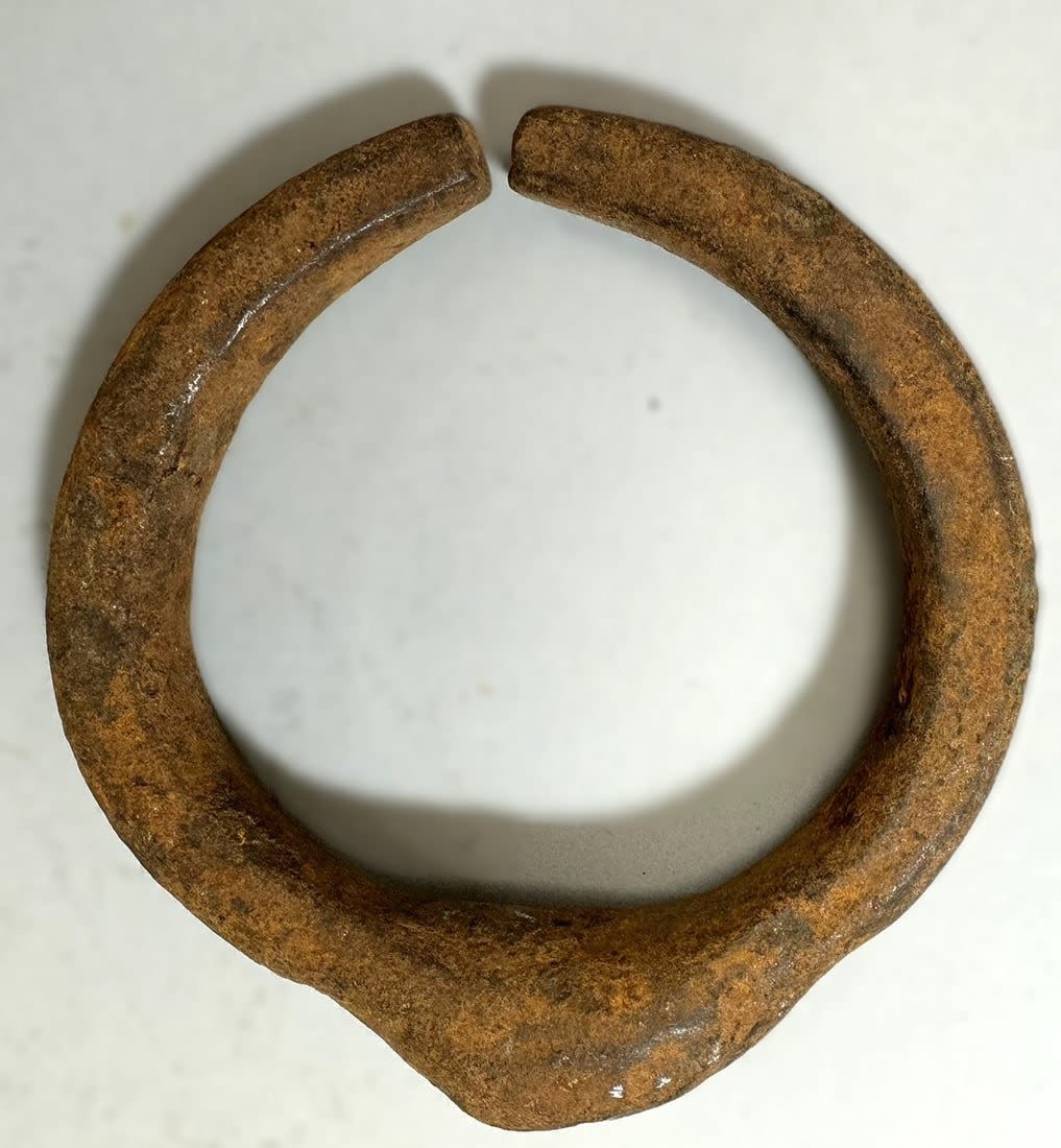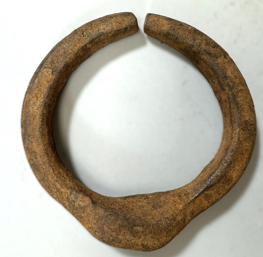 Three (3) iron items from Cameroon, including two (2) currencies, and a tool, Central Africa. Dimensions (approx.): 13" x 4" (tool), 4" diameter (bracelet) and 7.5" x 4.25" (currency)