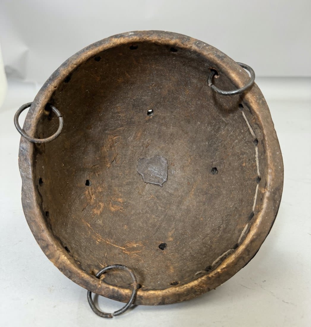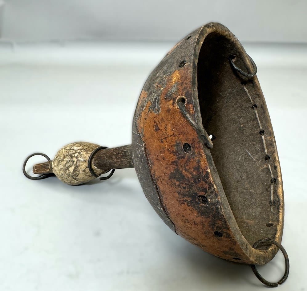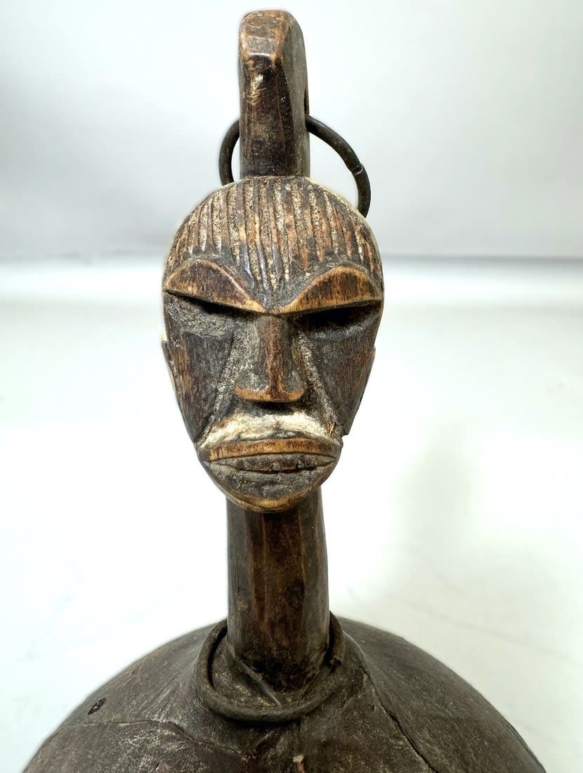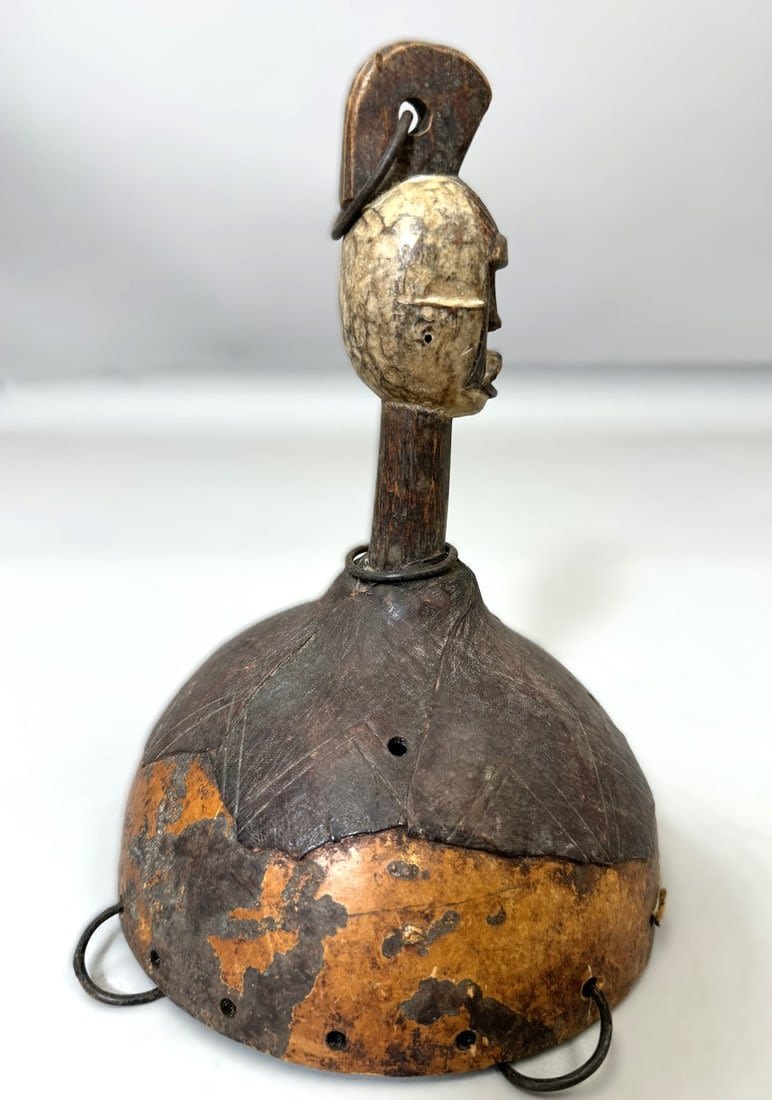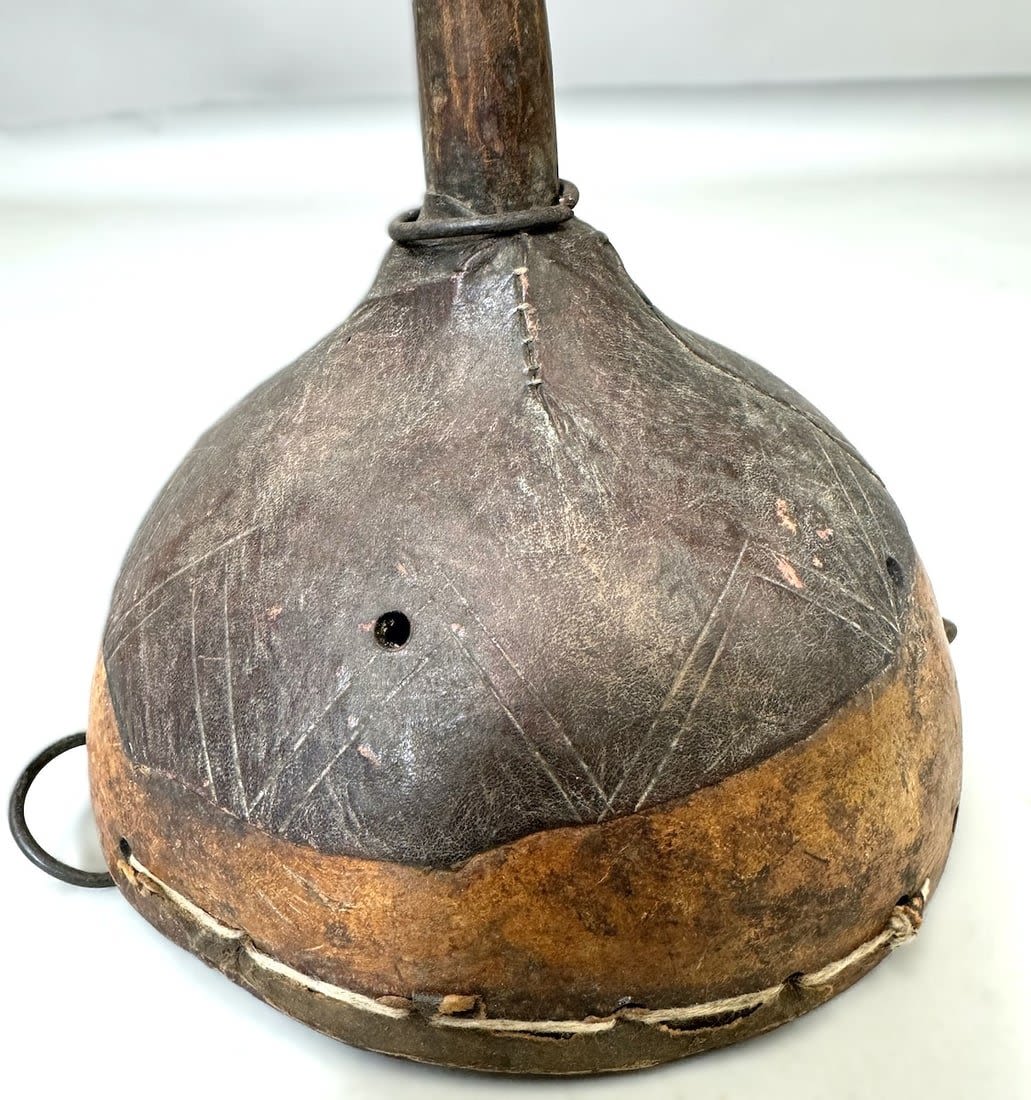 Gourd with figural carving and iron attachments, Africa. Dimensions (approx.): 10" x 7.25" diameter