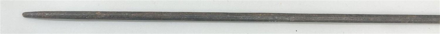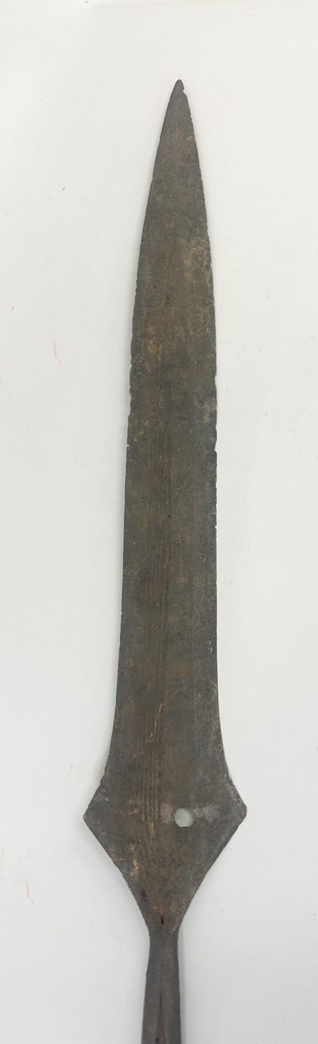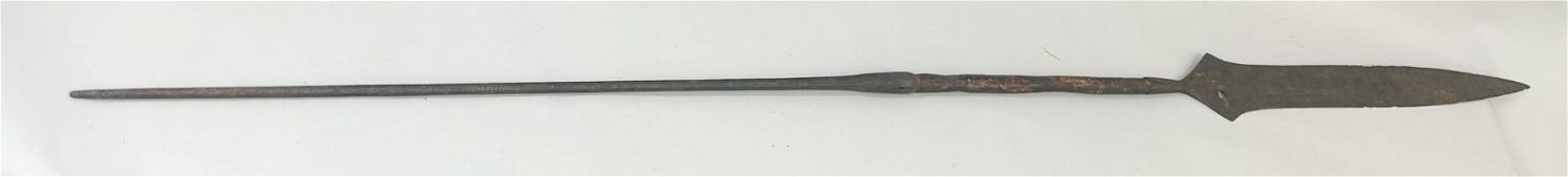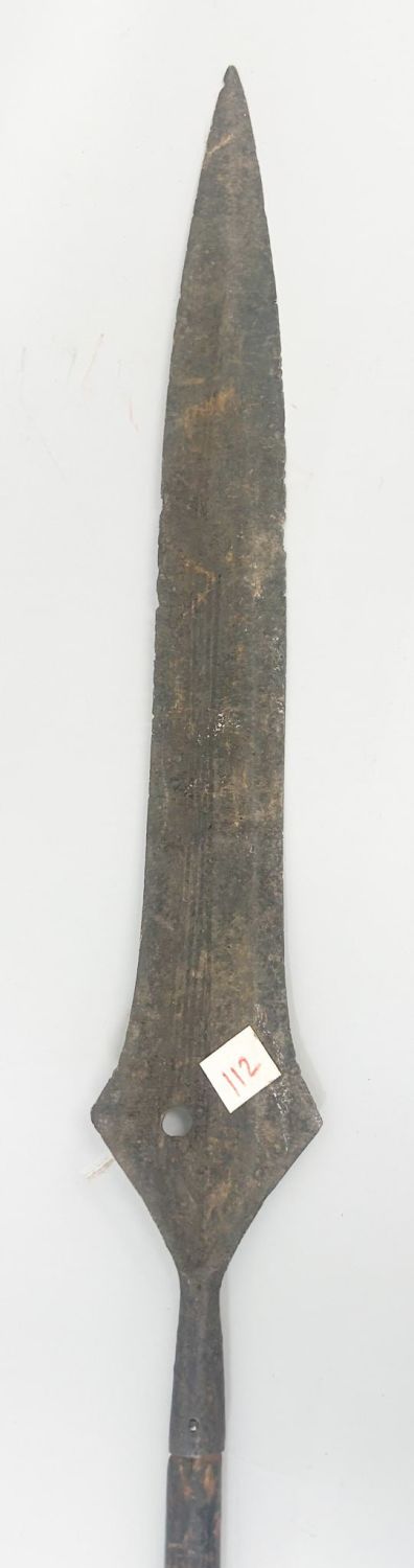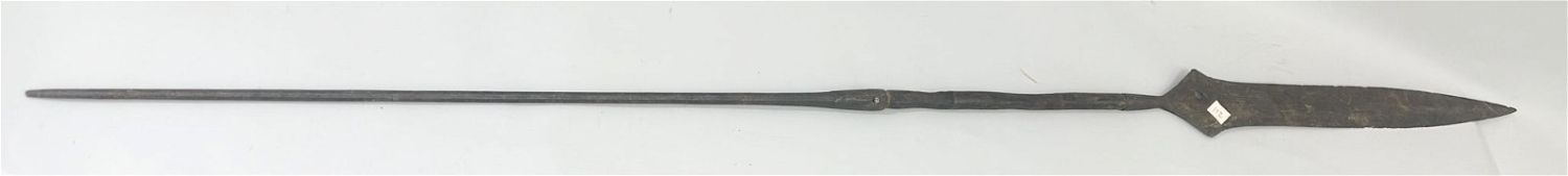Spear form currency blade, with wood shaft, exhibited at "Africa’s Iron and Copper Currencies", Institute of African Studies, Columbia University, New York, New York, March 2000, West or Central Africa. Approximate size, 79" long.