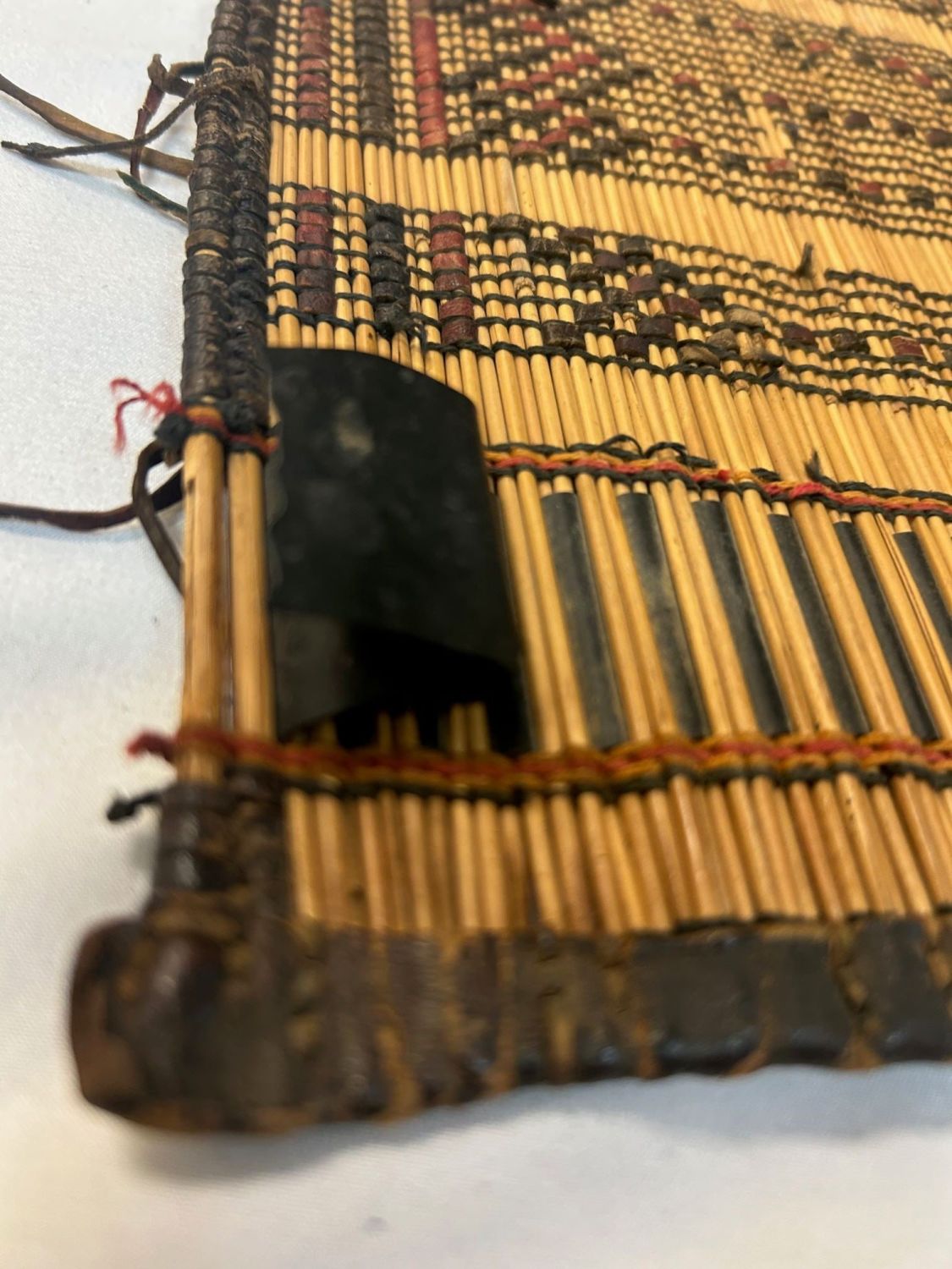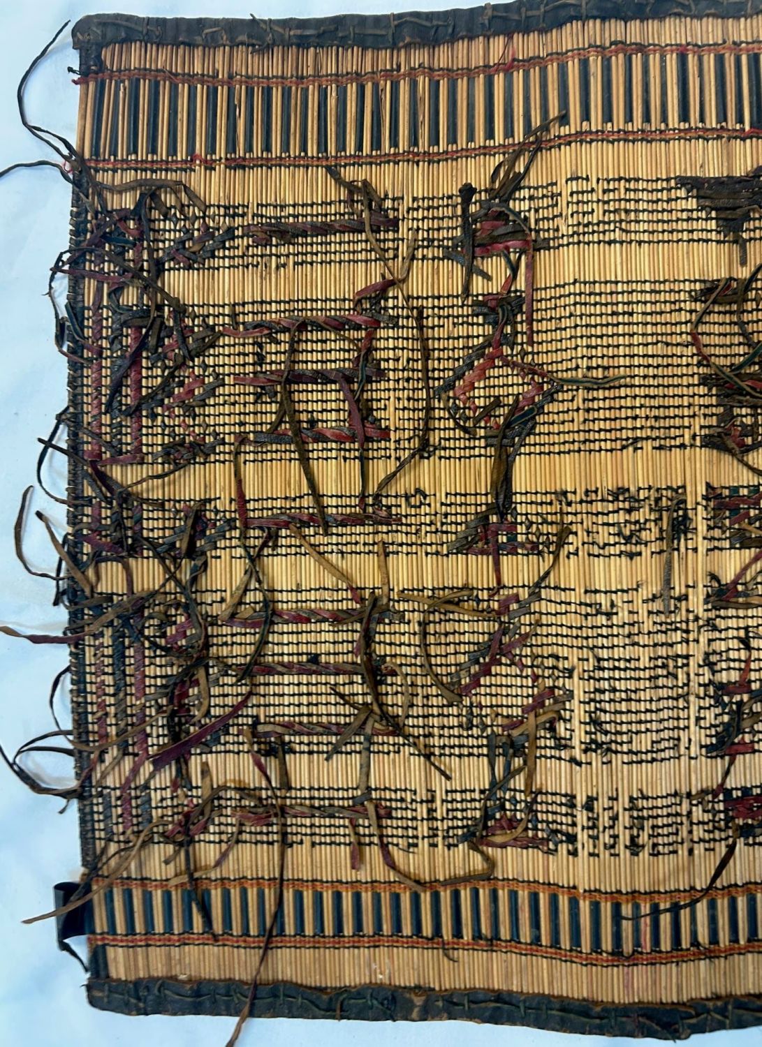 Kuba peoples, Democratic Republic of the Congo, Central Africa, woven raffia mat, leather edging, mid-20th century, 35" x 17"